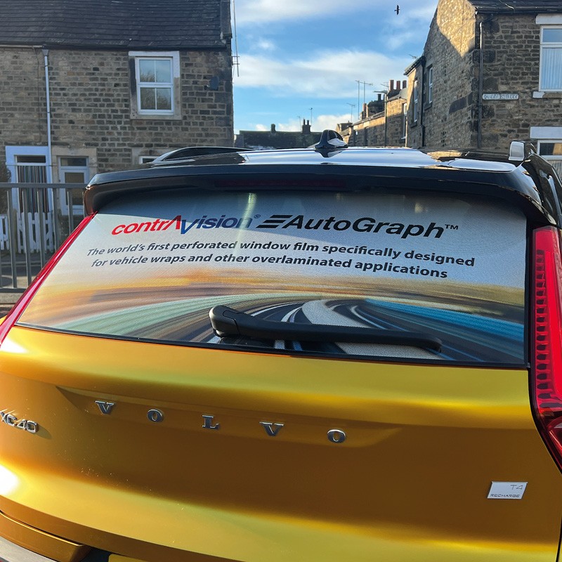 Le film microperforé Autograph™ White on Black de la marque Contra Vision® est un vinyle conçu pour des applications publicitaires de moyen à long terme, en particulier sur vitrages de véhicules.